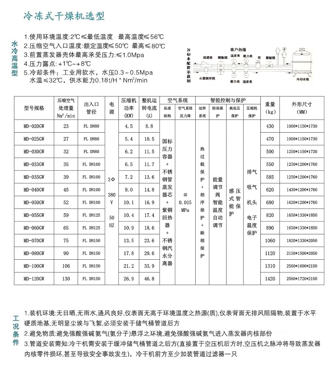 MD系列大机型水冷式冷冻式干燥机(MD-20GW-MD-120GW立方选型表