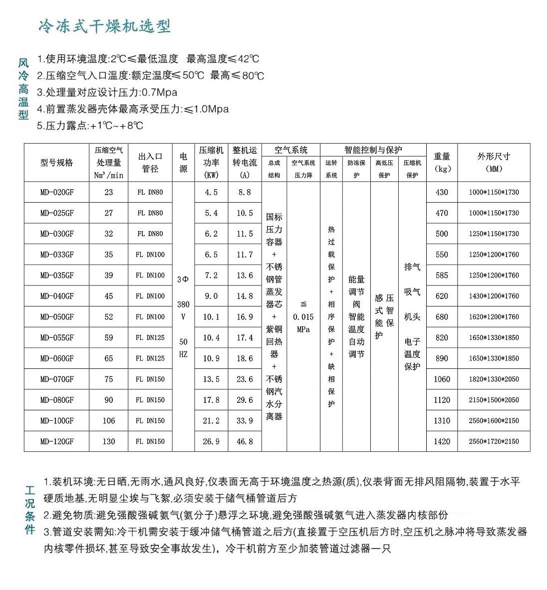 MD系列大机型风冷式冷冻式干燥机(MD-20GF-MD-120GF立方选型表